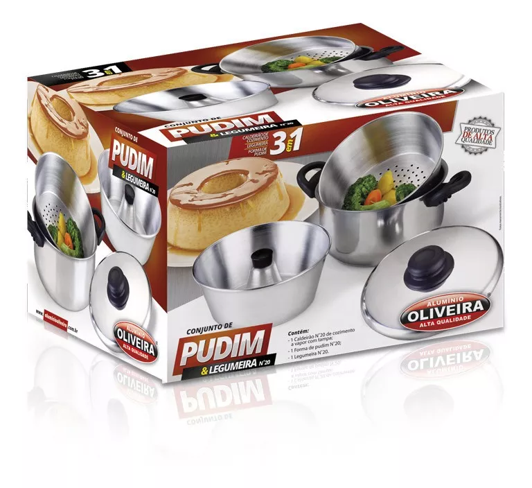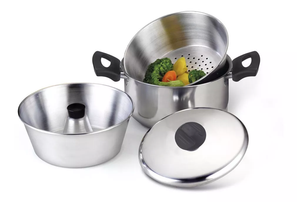 Descripcion: Olla diámetro 20 centímetros capacidad 3,5 litros. - Vaporera fondo perforado. - Flanera con tubo. - Tapa. Marca: Aluminio Oliveira. Origen: Brasil.