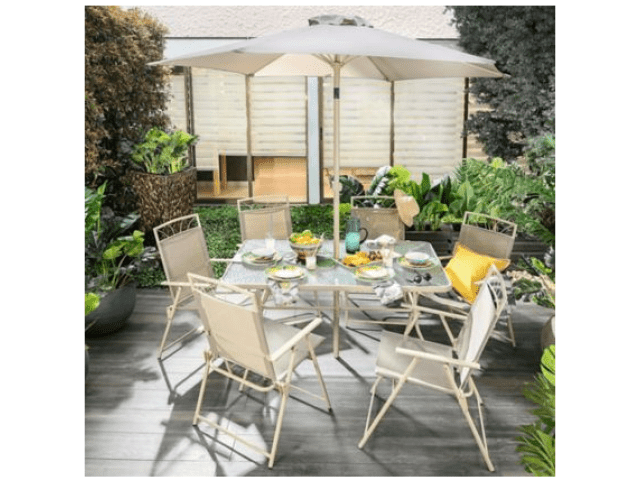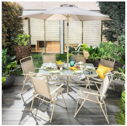 Juego de comedor exterior Santa Lucia de acero 8 piezas taupe. Mesa vidrio y metal 1.45 cm de largo x 0.92 cm de ancho. 6 sillas plegables de textilina y metal. Sombrilla con brazo movible y con roldana.