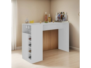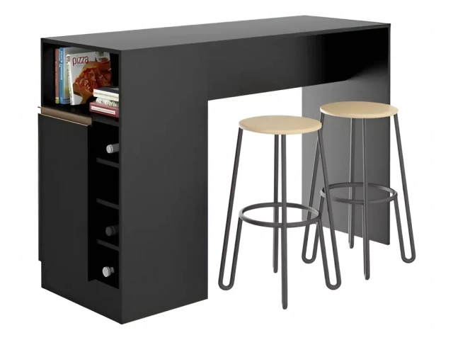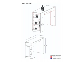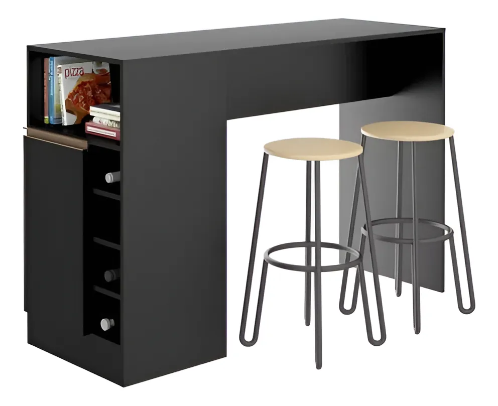 Descripción MESADA DESAYUNADOR CON BOTELLERO, ESTANTES Y PUERTA. (NO INCLUYE BUTACAS) medidas: 1.40x0.92x0.50 COLOR NEGRO . CARVALHO Y BLANCO.